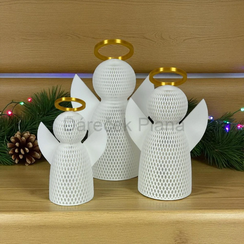 Elegantní 3D tištěná andělka s jemně prolamovaným vzorem a zlatou svatozáří 💛
