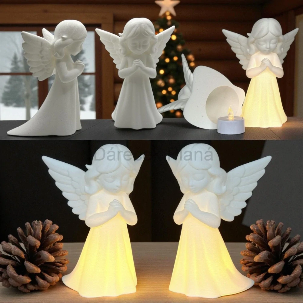 Díky LED čajové svíčce, která krásně prosvětluje jeho tělo, působí andílek velmi útulně – jako by střežil váš domov v tichu zimního večera 🎄