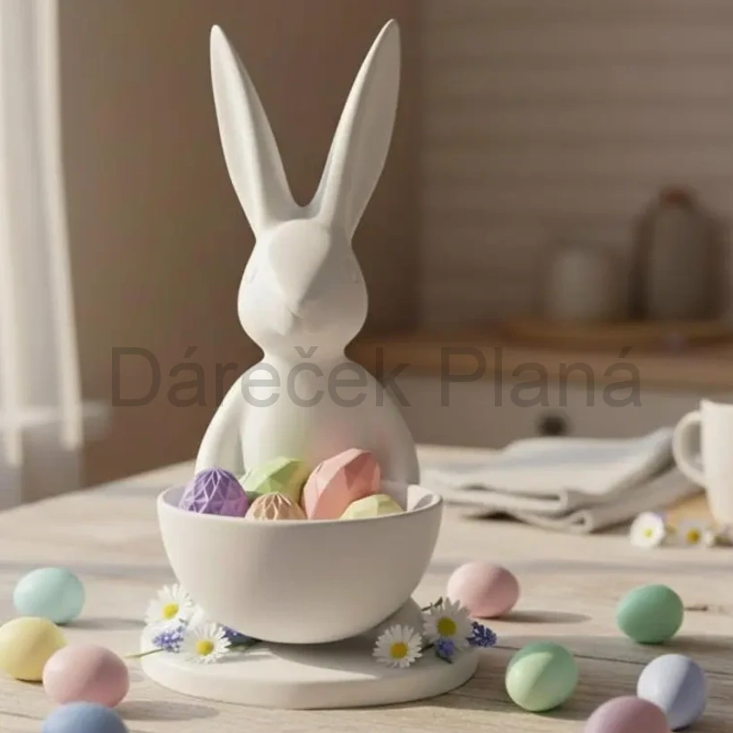 Velikonoce v novém světle! 🌷 Zapomeňte na klasické figurky. Náš 25cm zajíc je spojením moderního umění a praktičnosti. Díky unikátnímu designu, kde zajíc v náručí drží prostornou misku, získáte stylový kousek na koledy, vajíčka nebo jarní aranžmá. Čisté linie a jemný matný povrch z něj dělají hvězdu každého stolu.