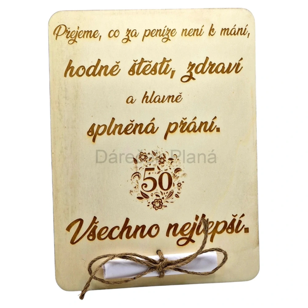 Originální dárková destička z kvalitní překližky s textem a rokem narozenin. Ve spodní části destičky jsou dva praktické otvory, do kterých lze elegantně uvázat bankovky jako originální finanční dar. Díky preciznímu zpracování a jedinečnému designu je destička ideálnímu dárku pro narozeninovou oslavu. Spojuje v sobě praktičnost i estetický vzhled, čímž potěší každou oslavenci. Skvělý způsob, jak darovat peníze.