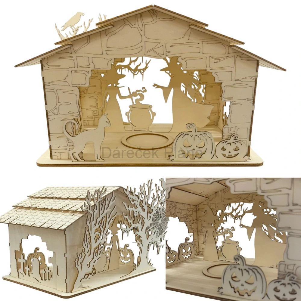 Tato originální dřevěná lucerna z topolové překližky je zdobená čarodějnicí míchající lektvar v kotlíku 🧪🧙♀️, dýněmi 🎃, černou kočkou 🐈⬛ a havranem ☠️. Detailní siluety a propracované motivy dodají vašemu domovu nezaměnitelné kouzlo.