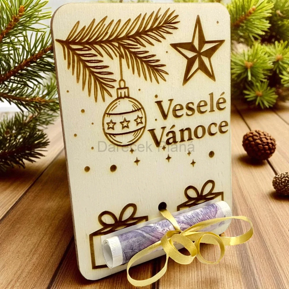 Dřevěná karta na peníze – Veselé Vánoce s hvězdou a větvičkou
