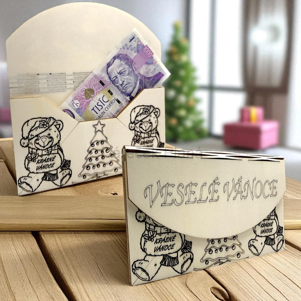 Vánoční obálka na peníze z dřeva – motiv Medvídek a stromek