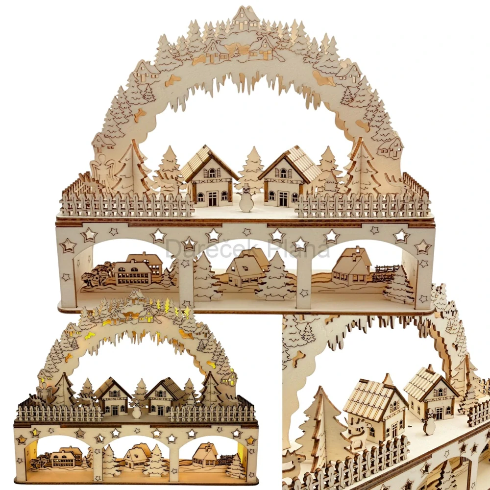 Přeneste se do kouzelného světa Vánoc 🎅❄️! Tato detailně propracovaná dřevěná zimní vesnička z topolové překližky navodí tu pravou sváteční atmosféru. Vesnička je zdobená chaloupkami 🏠, stromečky 🌲 a sněhulákem ⛄, nad nimiž se klene oblouk s horskými domečky.