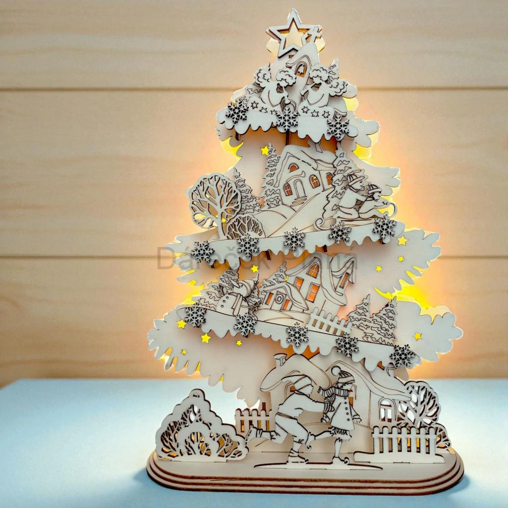 Tento nádherný dřevěný vánoční stromeček o velikosti 42 cm na výšku a 30 cm na šířku je perfektní dekorace pro všechny, kteří milují hřejivou atmosféru zimních svátků. Vyroben z kvalitní 3 mm překližky, do detailu propracovaný a vybavený LED světýlkem, které jemně prosvěcuje jednotlivé prvky – domky, stromečky i hvězdičky 🌟.