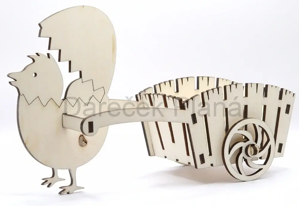 Kuřátko s vozíčkem z překližky je perfektním doplňkem pro každou jarní či velikonoční dekoraci! Do vozíčku lze snadno vložit vajíčko, drobné sladkosti nebo malý dárek, což z něj představuje ideální ozdobu i praktický dárek. Vyrobený z 3mm překližky, zajistí dlouhou životnost a snadno jej můžete doladit barvami nebo lakem podle svého vkusu. Jeho design potěší děti i dospělé a přinese do vašeho domova radost a originál. Pořiďte si toto jedinečné kuřátko ještě dnes a udělejte své Velikonoce nezapomenutelné.