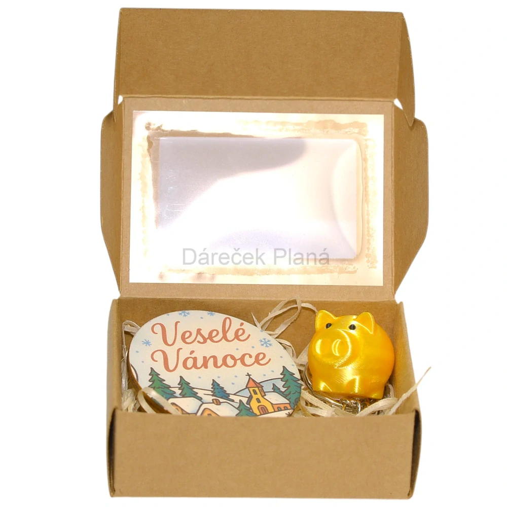 Kouzelná mini krabička s magnetkou Veselé Vánoce a zlatým prasátkem pro štěstí 🐷 – ideální maličkost pro kolegy, učitelky, kamarádky i děti.
