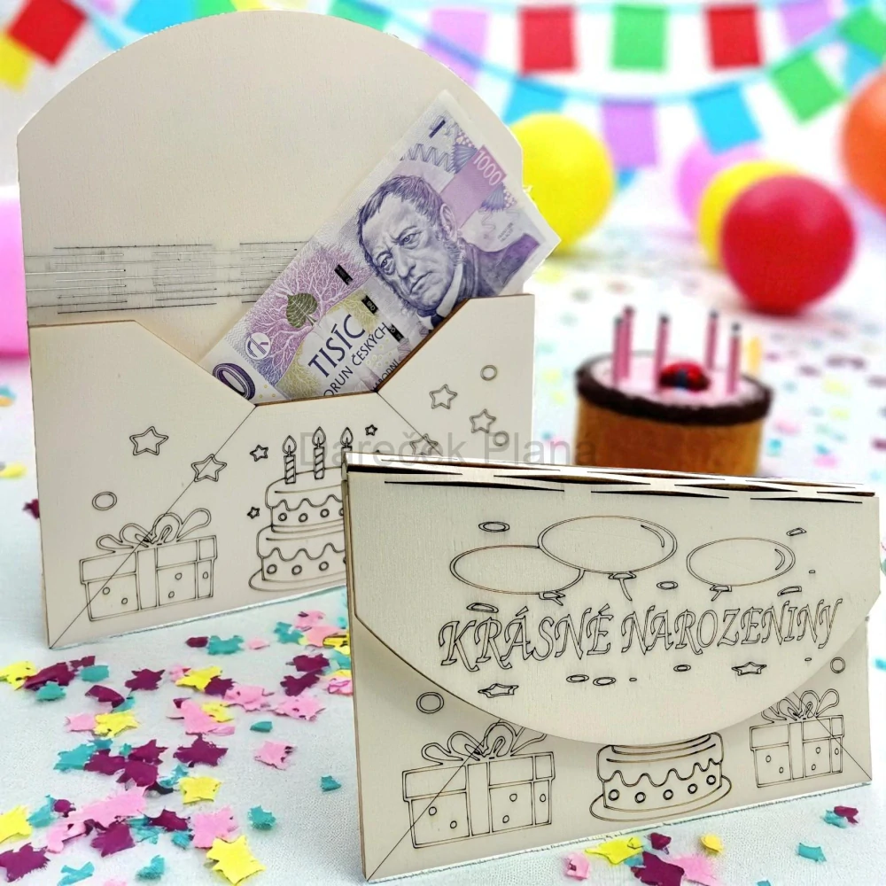 Narozeninová obálka na peníze z dřeva – Dort a dárečkySkladem 30 ks170 Kč/ ks