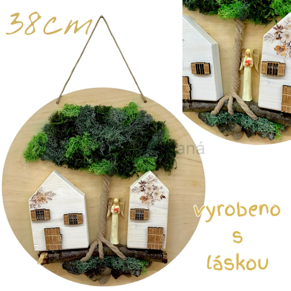 Objevte jedinečný 3D obraz „Andělský domov“ 👼🏡, který přináší harmonii přírodních materiálů a symboliku domova chráněného andělem. Ručně vyráběná dekorace zachycuje dva dřevěné domečky 🏠, anděla strážného 👼 a strom života 🌳, který vše propojuje v jeden harmonický celek.