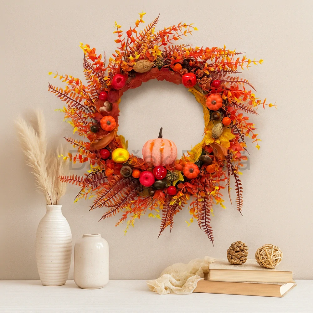 🍁 Tento bohatě zdobený podzimní věnec v sytých barvách oranžové, červené a žluté přinese do vašeho domova teplo, útulnou atmosféru a kouzlo podzimu. 🎃 Dýně, listy a podzimní plody vytváří dojem živé přírodní kompozice, která nikdy nezvadne.