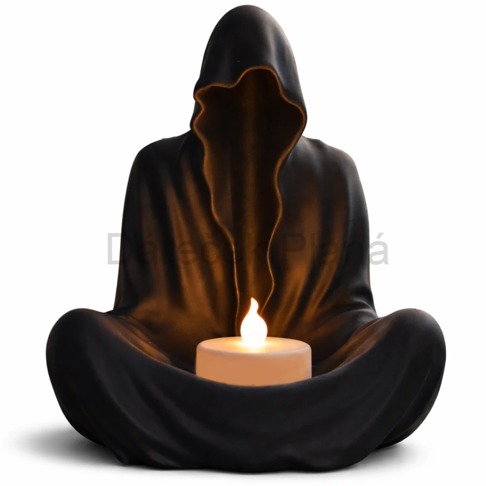 Tajemná postava zahalená v plášti držící světlo působí klidně, mysticky a elegantně zároveň.