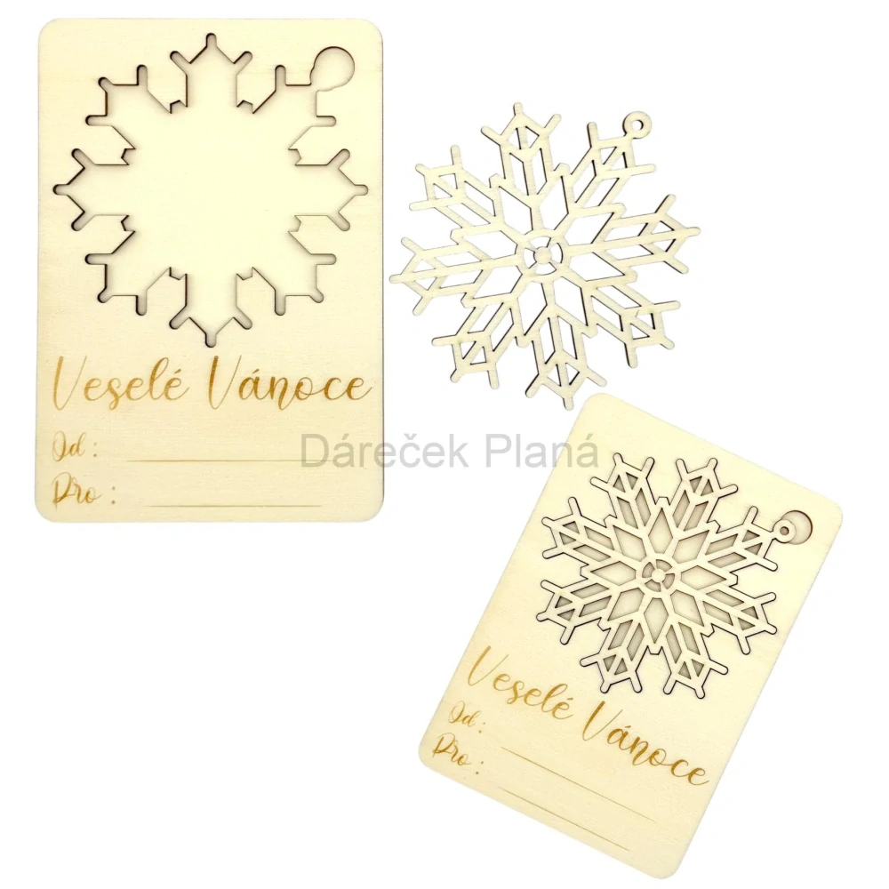 Každá karta obsahuje vyjímatelnou dřevěnou vločku, kterou si obdarovaný může pověsit na stromeček. 🎁🌲