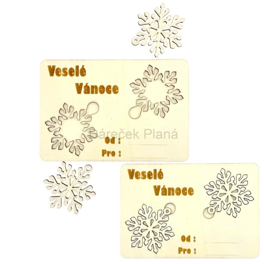 Každá karta obsahuje vyjímatelnou dřevěnou vločku, kterou si obdarovaný může pověsit na stromeček. 🎁🌲