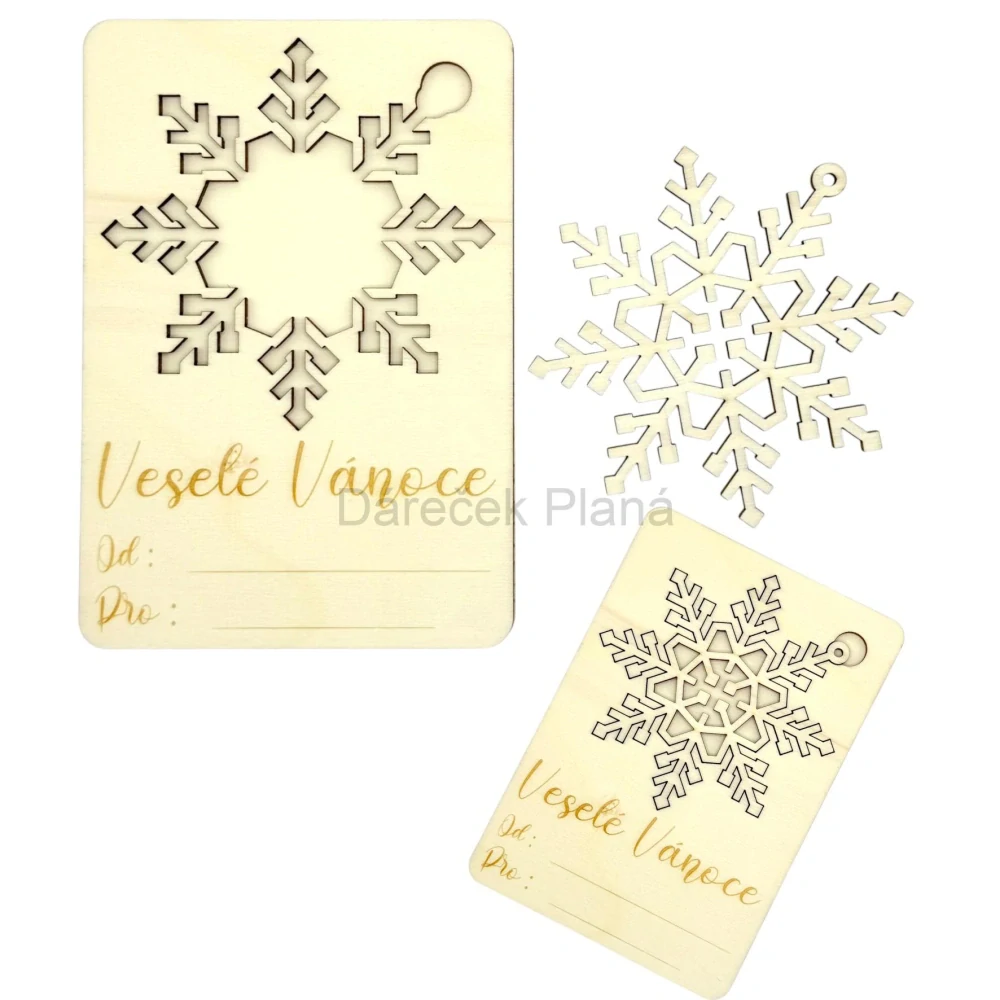 Každá karta obsahuje vyjímatelnou dřevěnou vločku, kterou si obdarovaný může pověsit na stromeček. 🎁🌲