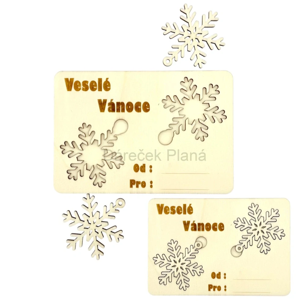 Každá karta obsahuje vyjímatelnou dřevěnou vločku, kterou si obdarovaný může pověsit na stromeček. 🎁🌲