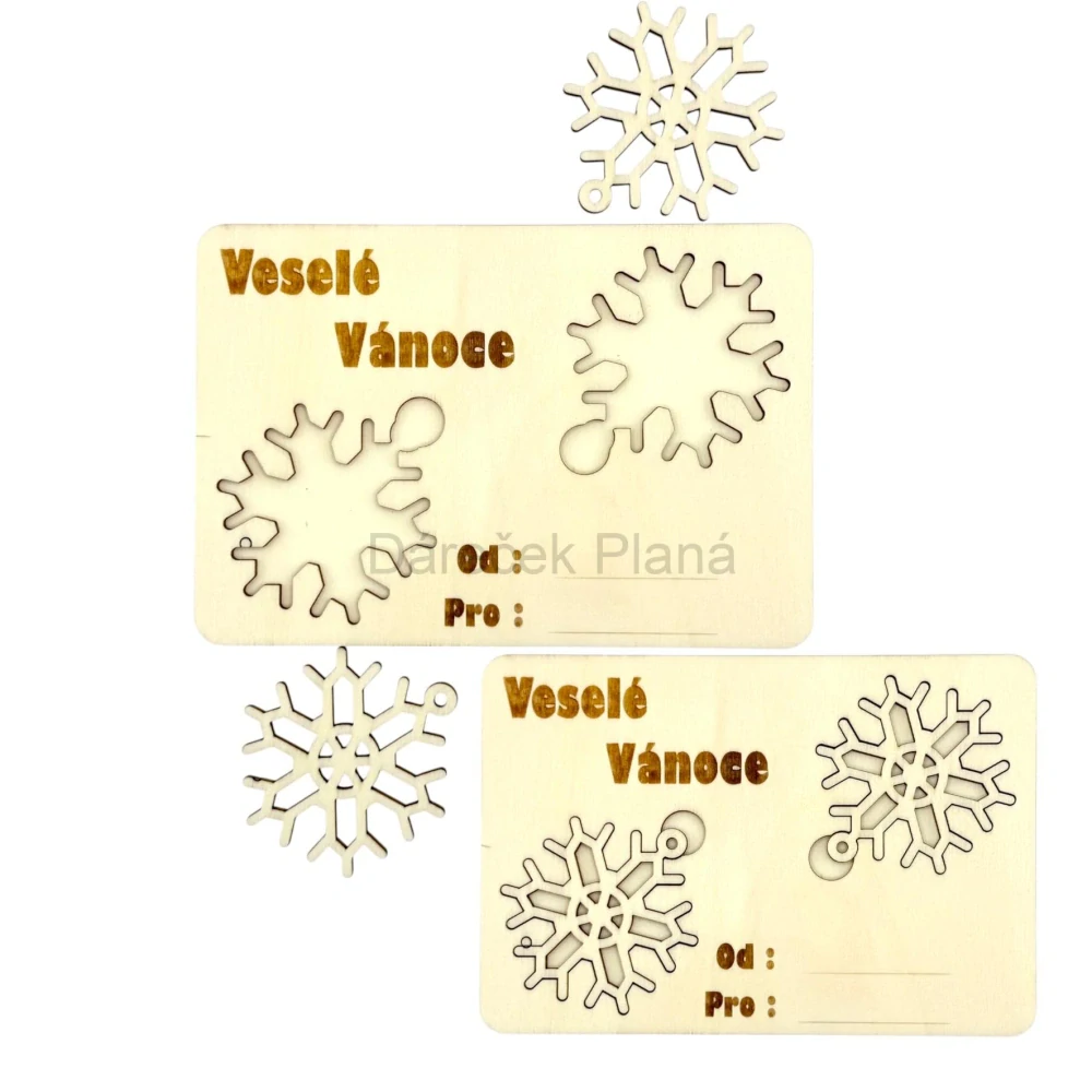Každá karta obsahuje vyjímatelnou dřevěnou vločku, kterou si obdarovaný může pověsit na stromeček. 🎁🌲