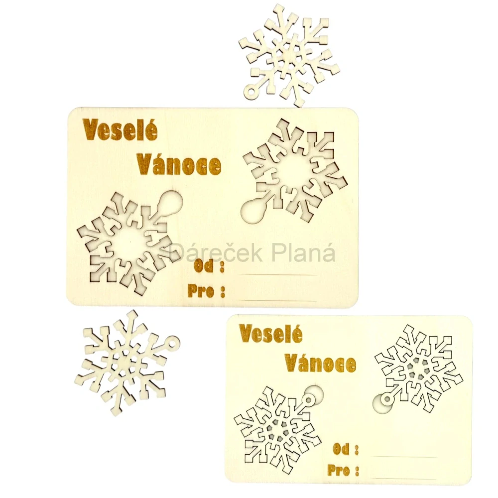 Každá karta obsahuje vyjímatelnou dřevěnou vločku, kterou si obdarovaný může pověsit na stromeček. 🎁🌲