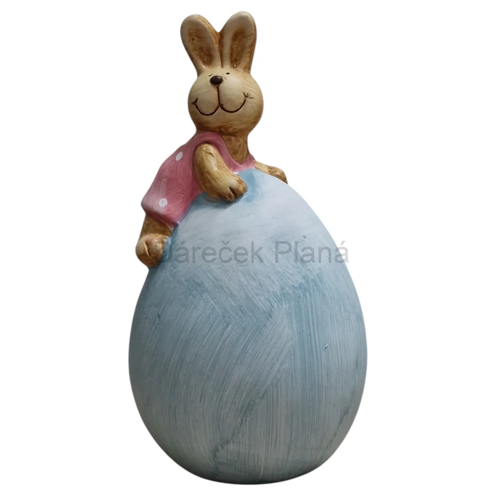 Tato půvabná velikonoční dekorace představuje velké modré vajíčko, na kterém pohodlně leží usměvavá zaječí holčička v růžových šatech. Díky jemným detailům a pestrým barvám přinese do vašeho domova svěží jarní atmosféru. Vyrobena z kvalitní keramiky, je odolná s dlouhou životností. Perfektně se hodí na stůl, poličku nebo jako součást velikonoční výzdoby. Tato roztomilá dekorace je také skvělým tipem na dárek.