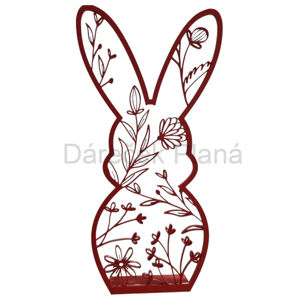 Elegantní červený zajíček se stříbrným proužkem je unikátní dekorací vytvořenou pomocí 3D tisku. Uvnitř jeho siluety se nachází krásné kytičky, které dodávají výrobky jemný a originální vzhled. Jeho minimalistický design a kombinace barev se hodí do moderního i tradičního interiéru. Tento zajíček je ideální doplněk na jarní a velikonoční výzdobu vašeho domova. Díky kvalitnímu zpracování je lehký, odolný a snadno přemístitelný.