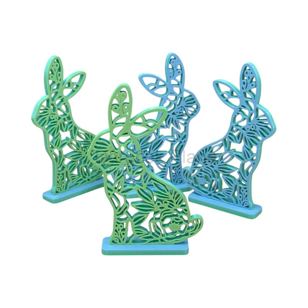 Tento zajíček z 3D tisku je dvoubarevný zeleno modrý elegantní dekorace pro každý prostor. Jeho povrch je jemně zdobený natisknutými kytičkami, které dodávají originální vzhled. Zajíček je umístěn na stabilním stojanu.