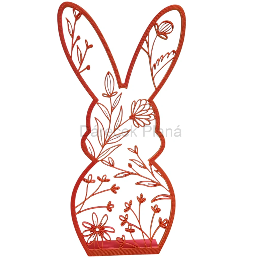Elegantní růžovooranžový zajíček je unikátní dekorací vytvořenou pomocí 3D tisku. Uvnitř jeho siluety se nachází krásné kytičky, které dodávají výrobky jemný a originální vzhled. Jeho minimalistický design a kombinace barev se hodí do moderního i tradičního interiéru. Tento zajíček je ideální doplněk na jarní a velikonoční výzdobu vašeho domova. Díky kvalitnímu zpracování je lehký, odolný a snadno přemístitelný.